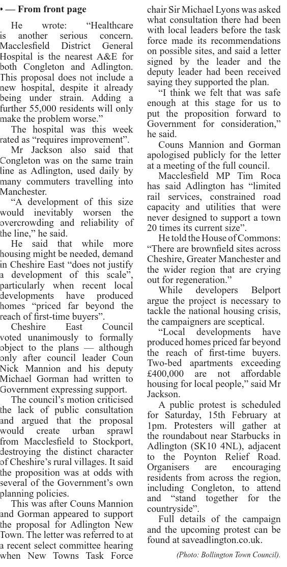 Today, the front page of the Congleton Chronicle featured the campaign to stop Adlington New Town, highlighting the issues it would cause for Congleton residents.